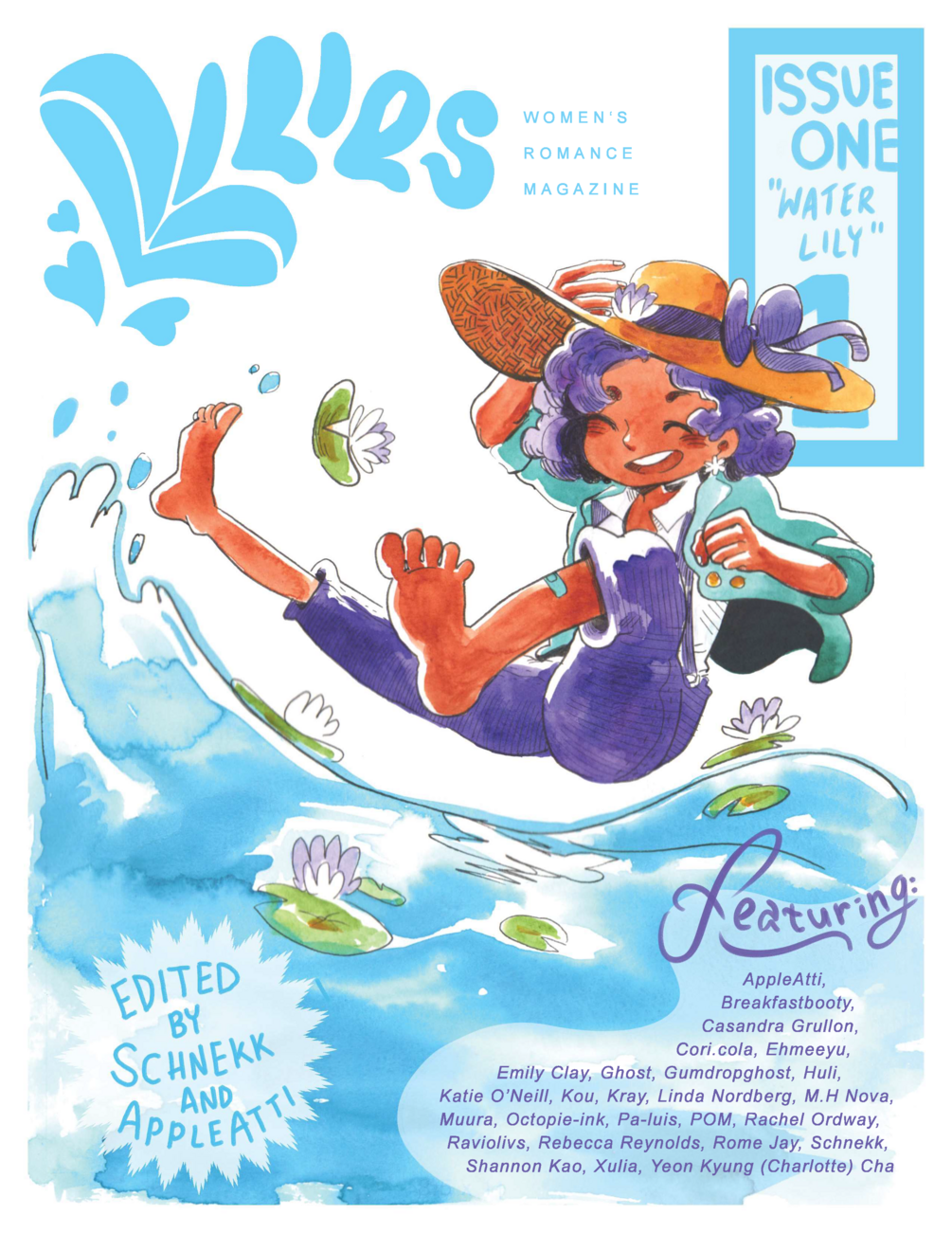Lilies Vol. 1: Water Lily features over 200 pages of art and comics by 28 artists: AppleAtti, Breakfastbooty, Casandra Grullon, Cori.Cola, Ehmeeyu, Emily Clay, Ghost, Gumdropghost, Huli, Katie O'Neill, Kou, Kray, Linda Nordberg, M.H Nova, Muura, Octopie-ink, Pa-luis, Phoebe Ayscough, POM, Rachel Ordway, Raviolivs, Rebecca Reynolds, Rome Jay, Schnekk, Shannon Kao, Trudi Elisabeth, Xulia, Yeon Kyung (Charlotte) Cha